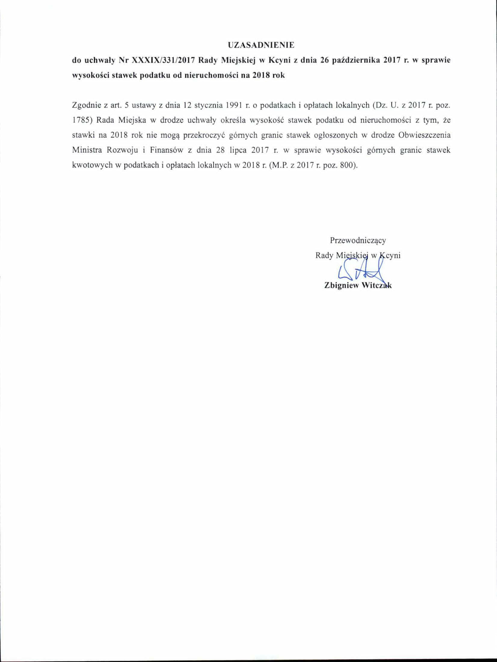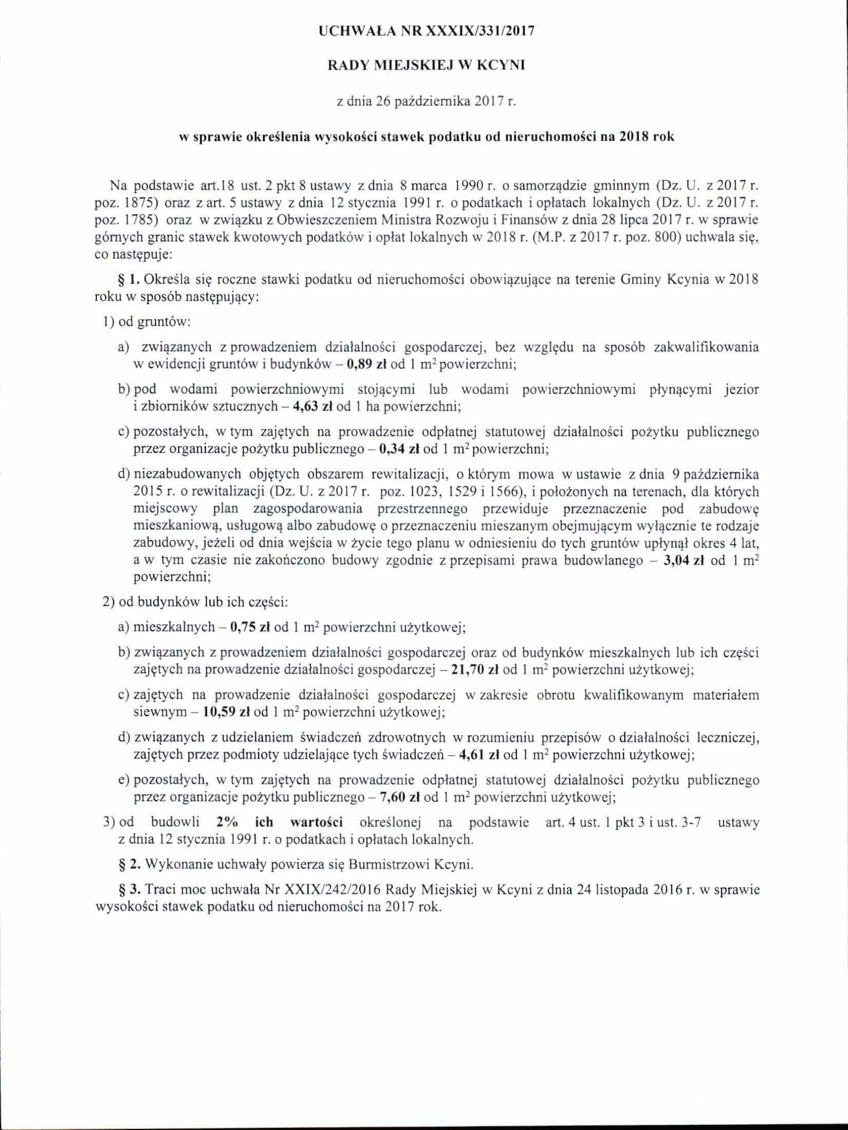 Uchwała Nr XXXIX/331/2017 Rady Miejskiej w Kcyni z dnia 26 października 2017 r. w sprawie określenia wysokości stawek podatku od nieruchomości na 2018 rok
